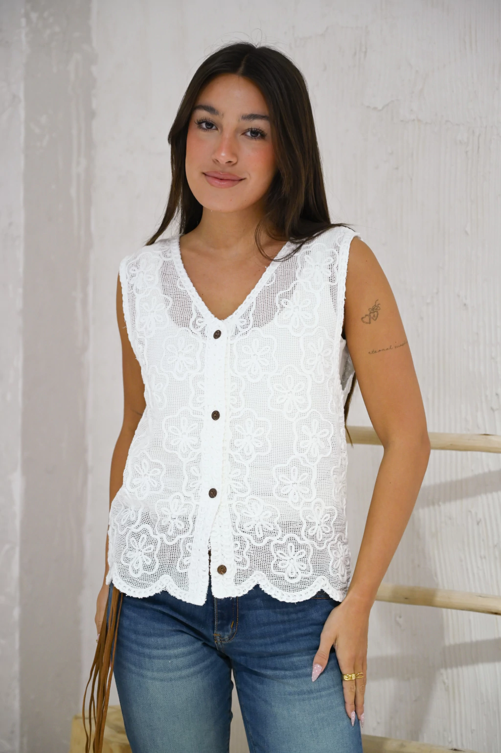 Delicada, fresca y con mucho estilo. Su diseño calado aporta un toque romántico y femenino, mientras que los botones frontales le suman un detalle elegante. Ideal para elevar cualquier look, ya sea casual o más arreglado. ¡Versátil, liviana y perfecta para todas las temporadas!