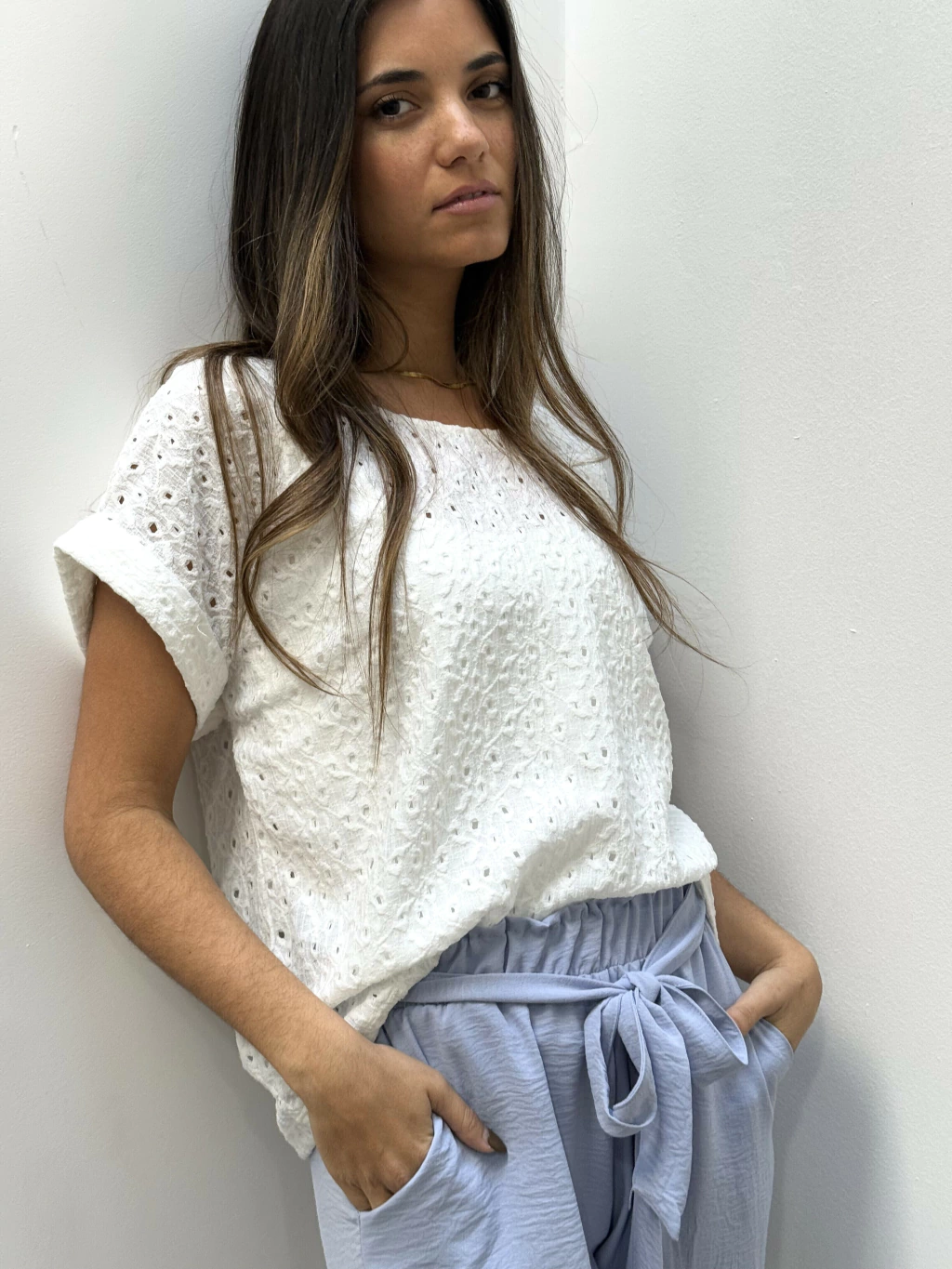 Ligera, versátil y con un encanto que no pasa desapercibido. Esta blusa calada de manga corta, con su cuello redondo clásico, combina frescura y estilo en cada detalle. Su diseño permite que la piel respire y aporta un toque de sensualidad sutil, ideal para los días cálidos o las noches con estilo relajado. Perfecta para looks casuales o para elevar tu outfit con jeans, pantalones sastreros o faldas.