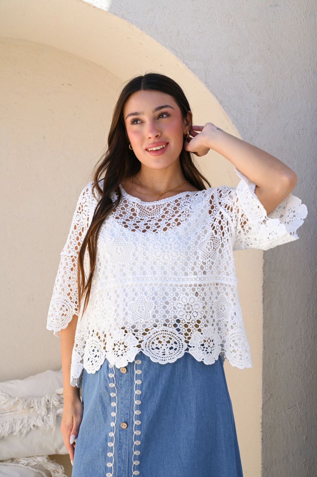 El aire boho romántico ideal. Blusa de tejido crochet calado con un hermoso patrón floral. Su escote y mangas 3/4 la hacen perfecta para un look veraniego, fresco y con una textura inigualable.