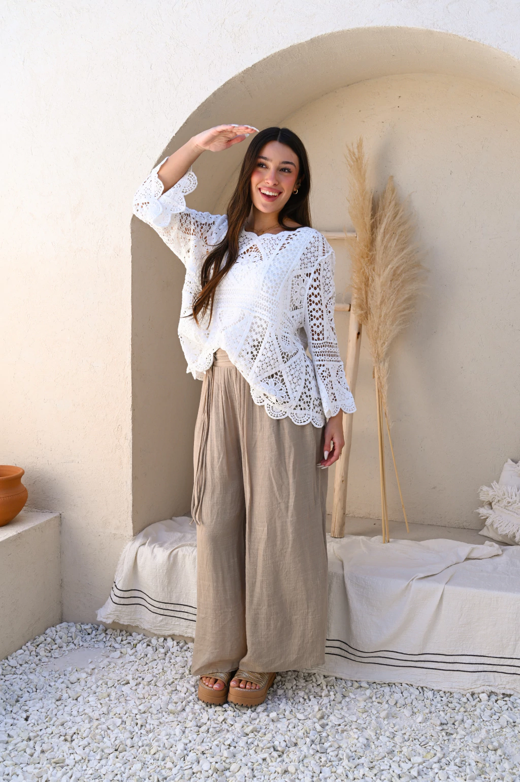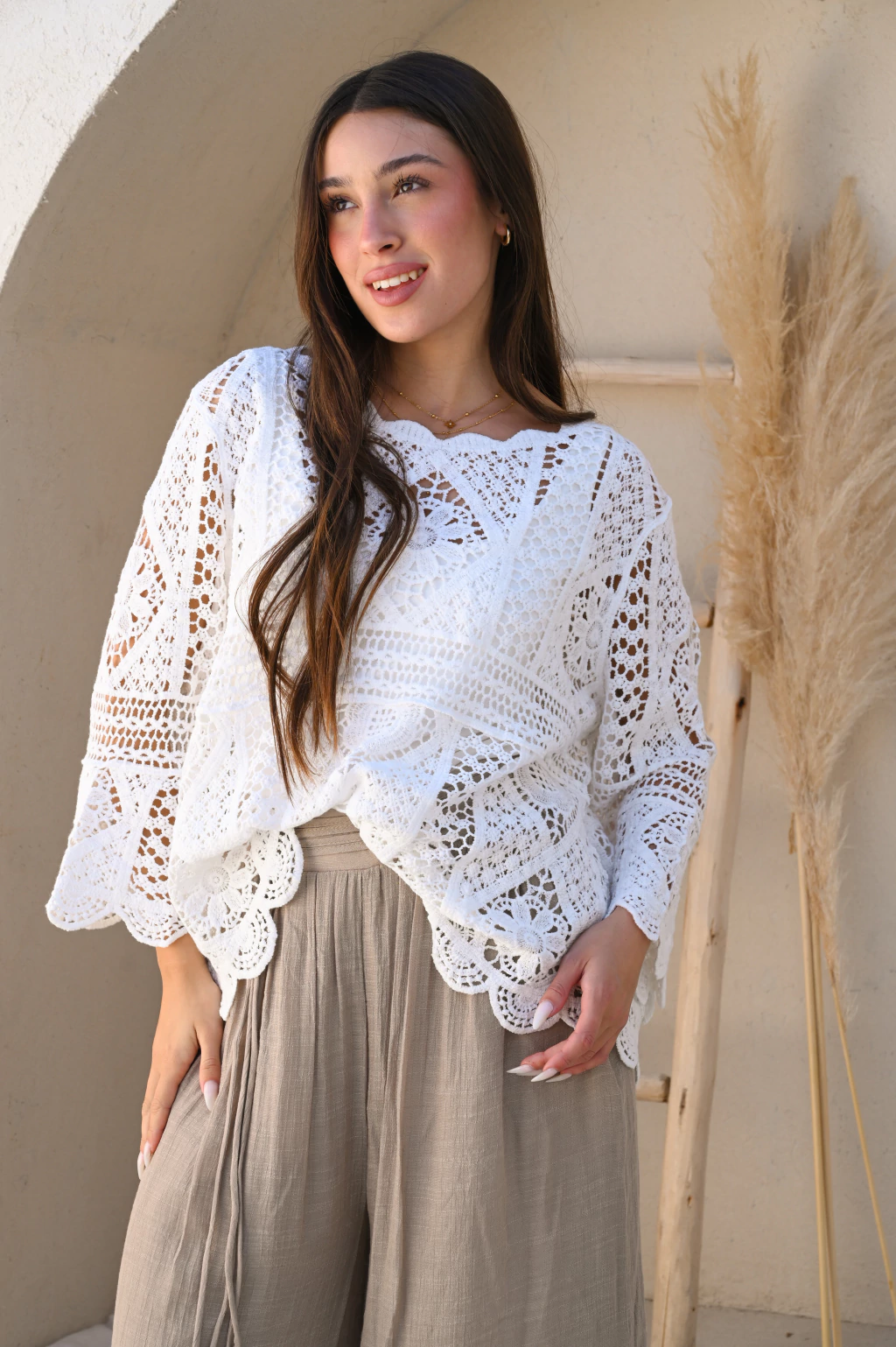 El encanto boho-romántico. Con su diseño calado, esta blusa es la aliada perfecta para tus looks más chic. Llévala con pantalones anchos de tonos neutros para un contraste de texturas que te hará lucir espectacular y fresca.