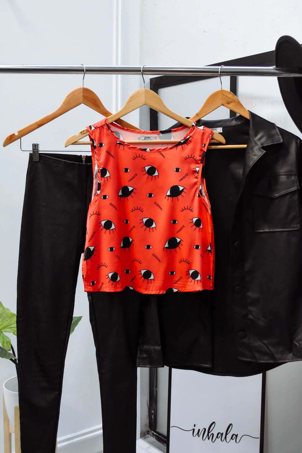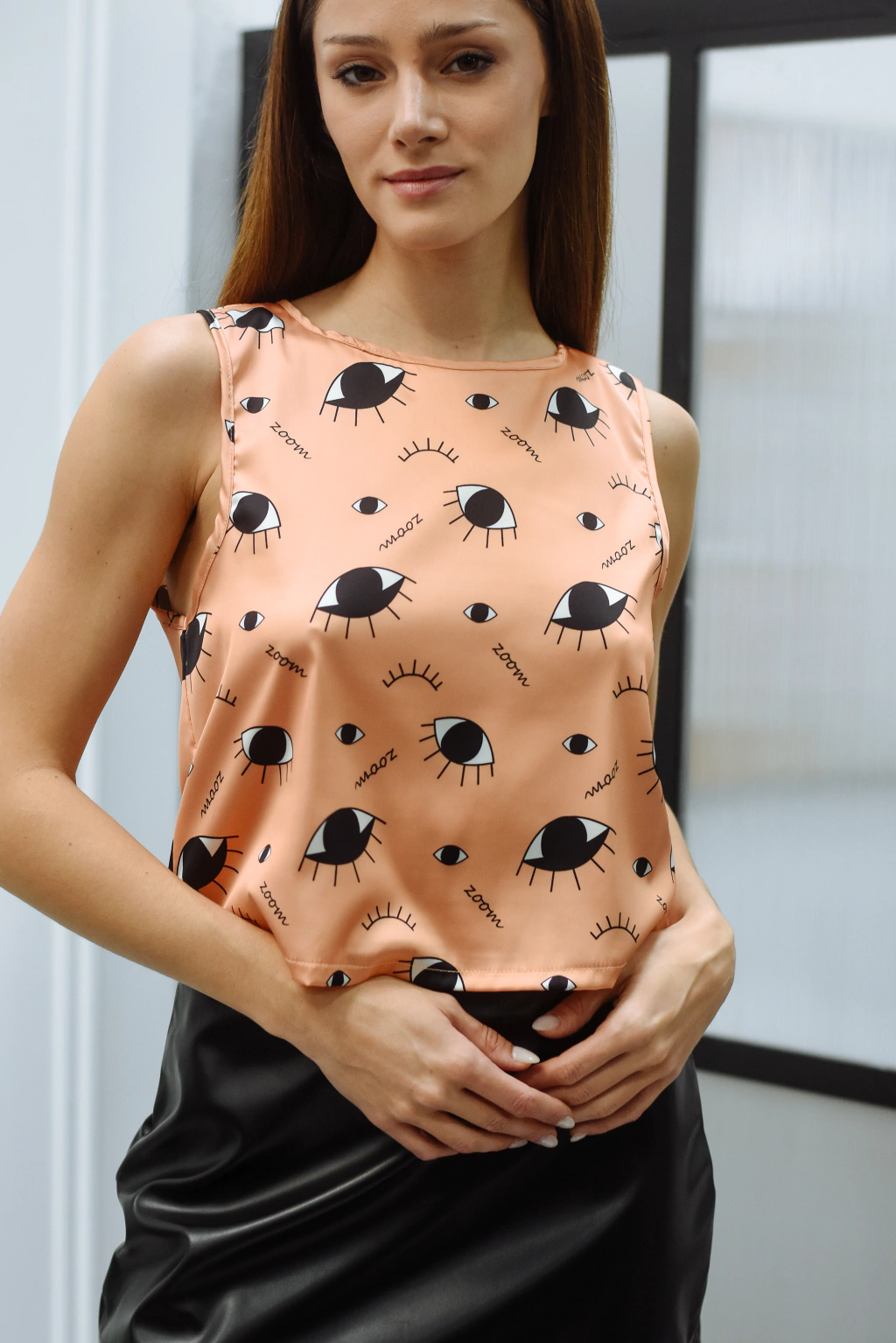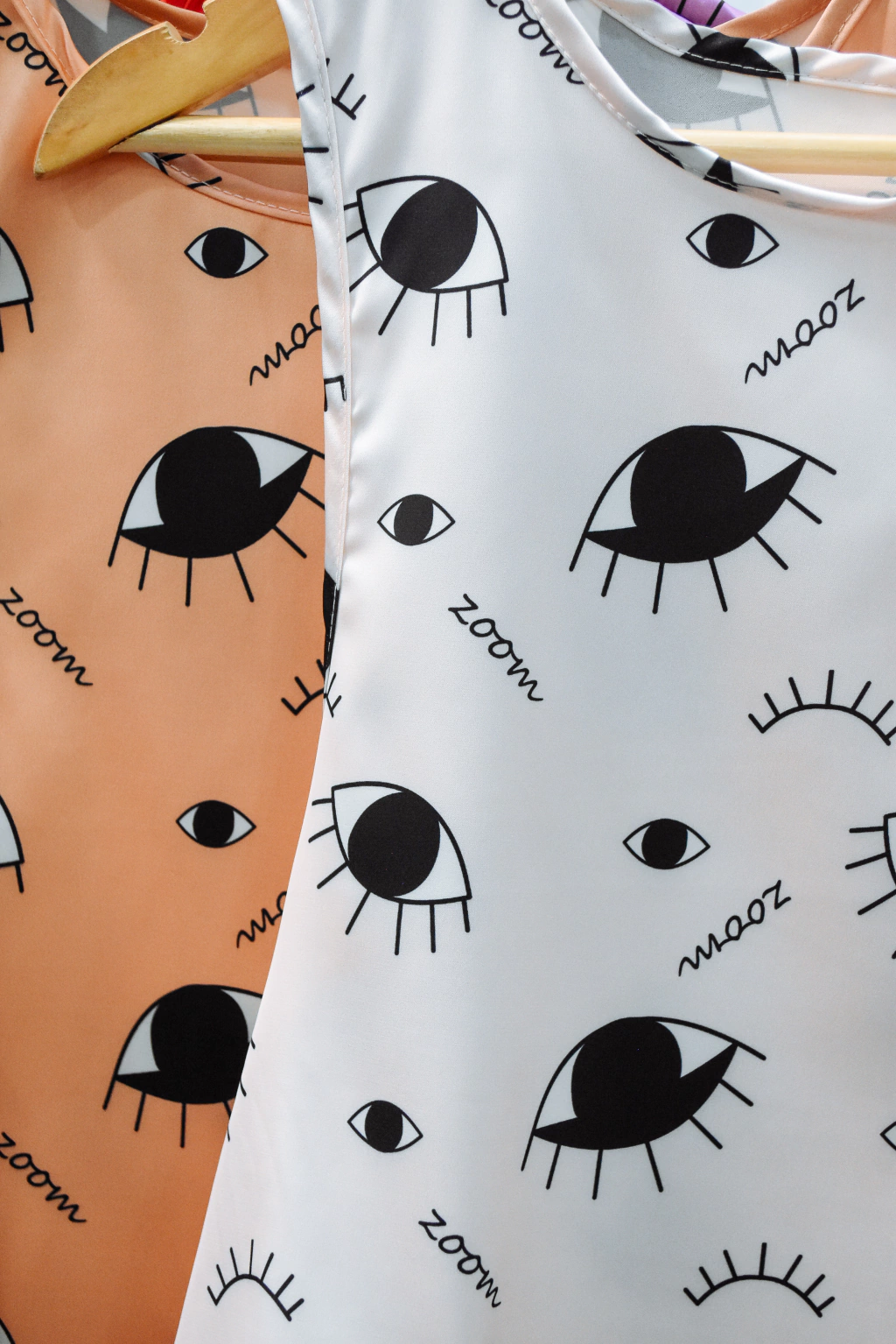 Esta blusa de seda estampada con ojitos y la palabra "Zoom" es puro guiño visual. Divertida, original y con mucha personalidad, transforma lo simple en algo inolvidable. Su diseño gráfico capta todas las miradas (literalmente) y su estilo hace la diferencia.