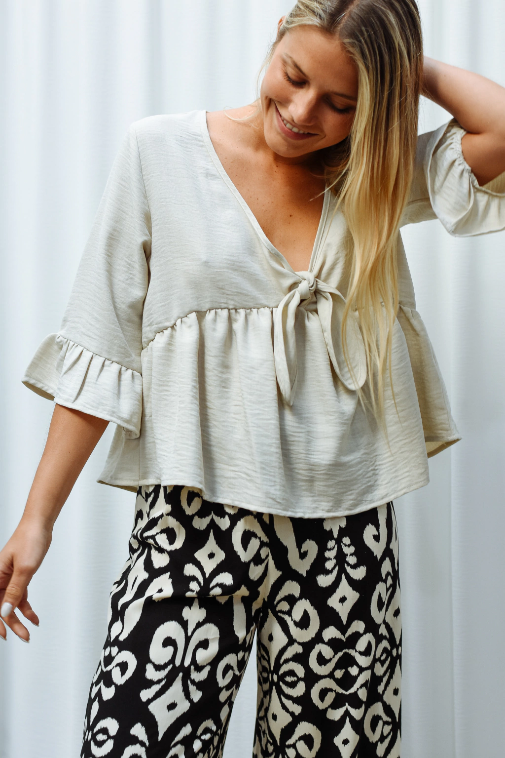 Femenina y con movimiento, esta blusa de manga con volados y nudo frontal aporta un toque fresco y delicado al look. Su diseño combina fluidez y detalle, ideal para un estilo relajado pero con personalidad. Perfecta para usar con jeans, pantalones sastreros o faldas.
