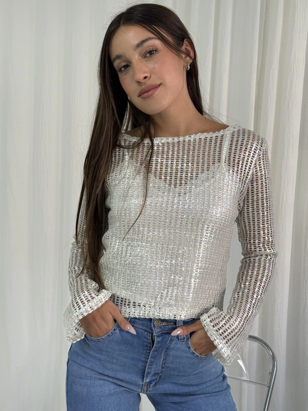 La modelo utiliza una talla S y sus medidas son: altura 1,67 mts, busto 85 cm y cadera 60 cm, lo que resalta la versatilidad de este buzo.
