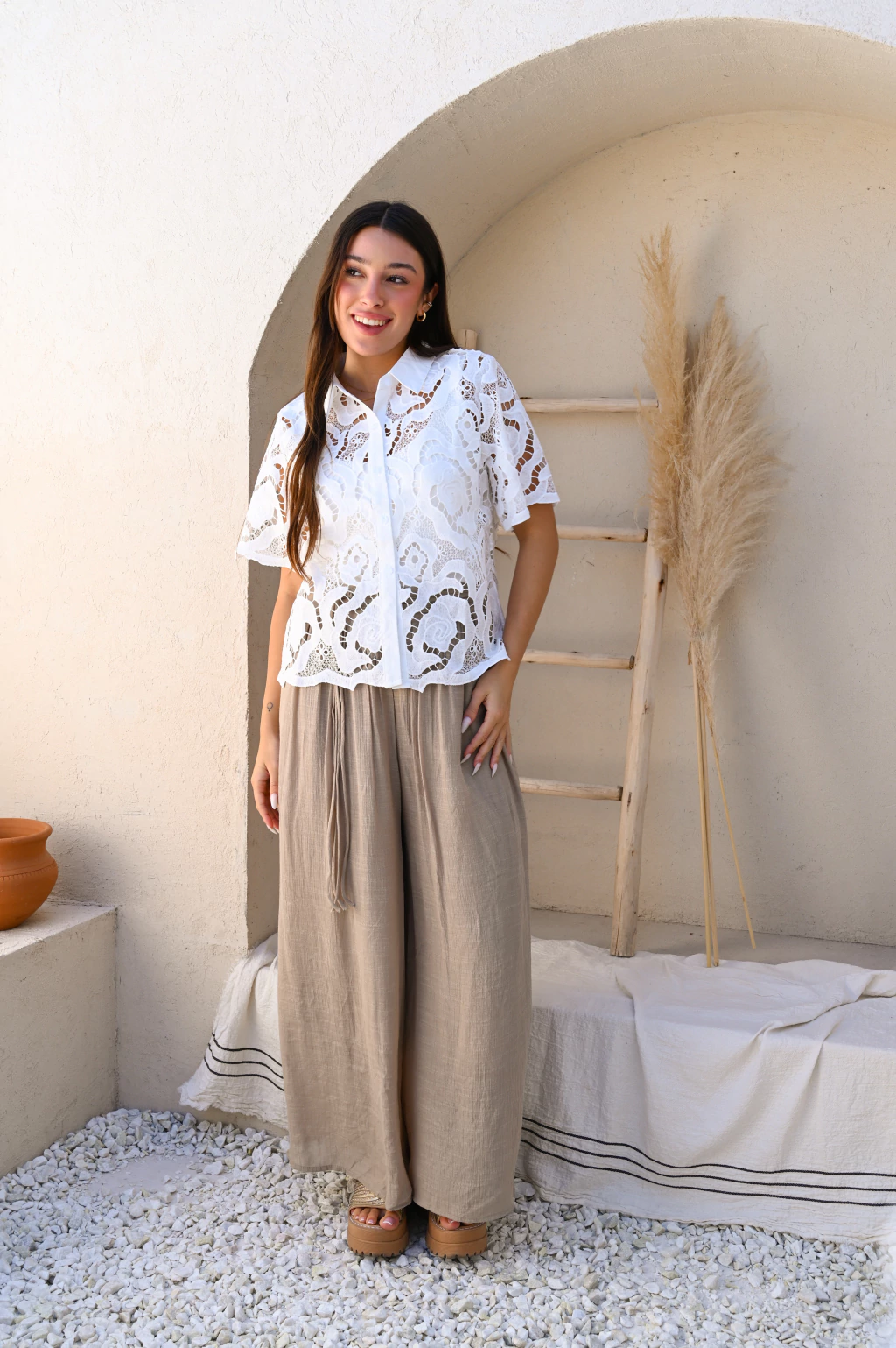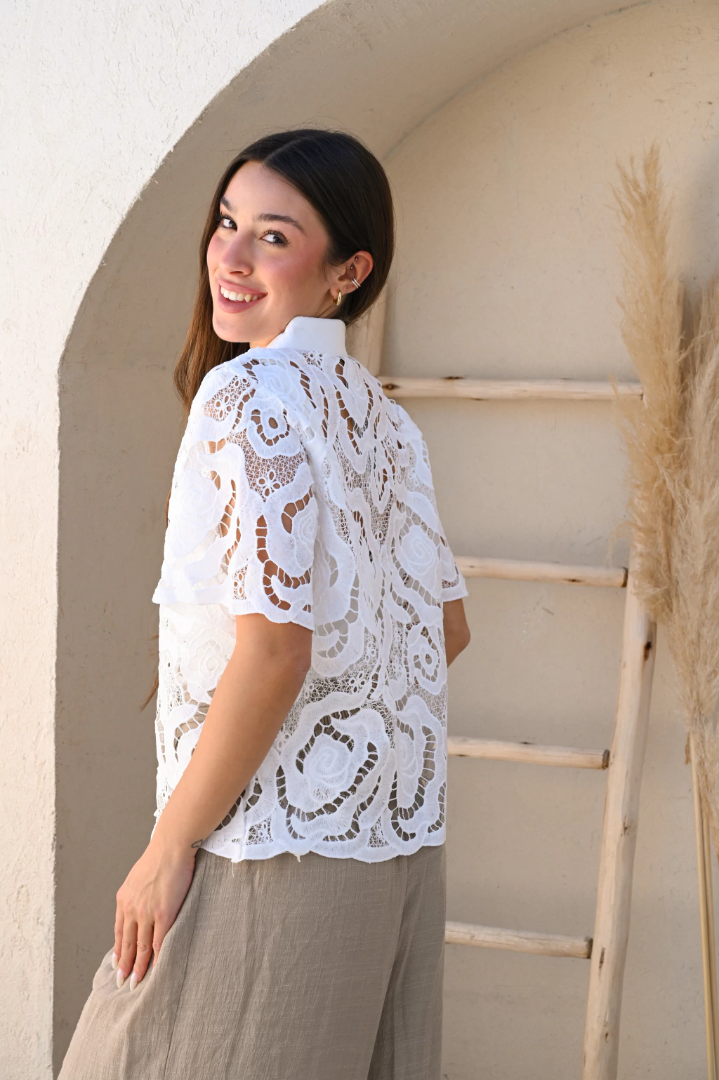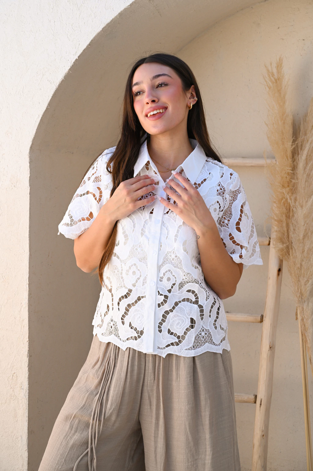 Camisa de brodery con volados, un clásico renovado que combina delicadeza y estilo. Con detalles calados, cuello camisero y un corte amplio que aporta frescura y elegancia natural. Ideal para un look femenino y versátil.