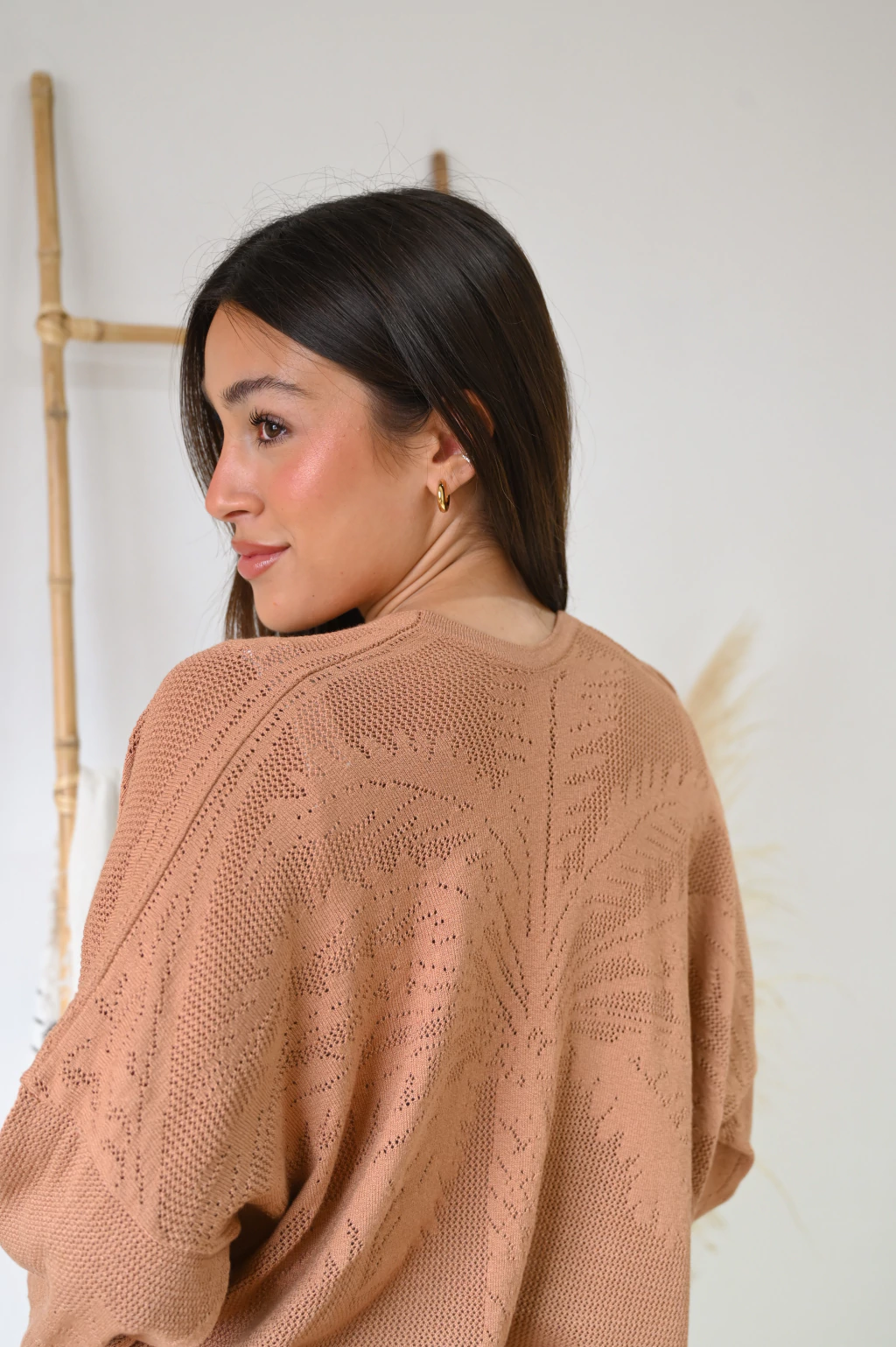 Esta capa calada es el complemento perfecto para tus looks de temporada. Su tejido liviano con sutiles detalles calados aporta un toque delicado y femenino, mientras su corte relajado y mangas amplias garantizan comodidad sin perder elegancia. Ideal para llevar sobre tops básicos o blusas, combina fácilmente con jeans, faldas o pantalones.