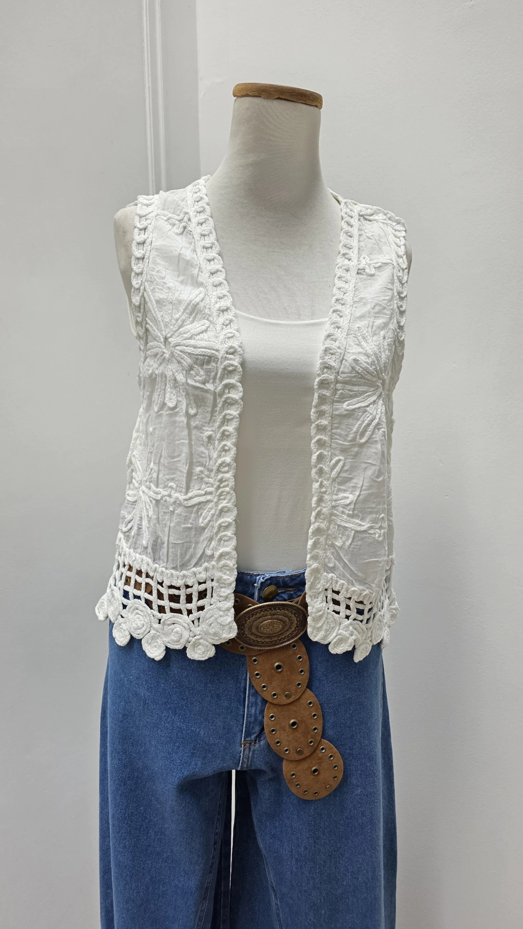 El toque romántico y ligero que tu outfit necesita. Chaleco abierto con intrincados bordados florales y detalles de crochet/encaje en los bordes. Su tono es perfecto para combinar y darle una textura bohemia y sofisticada a cualquier look.