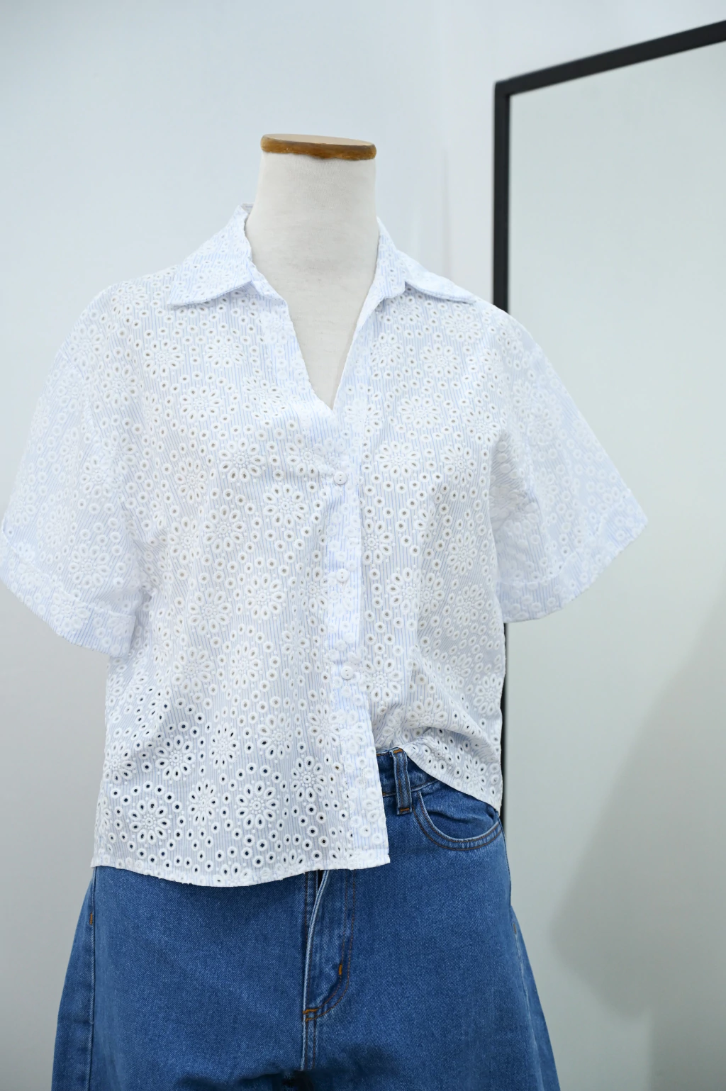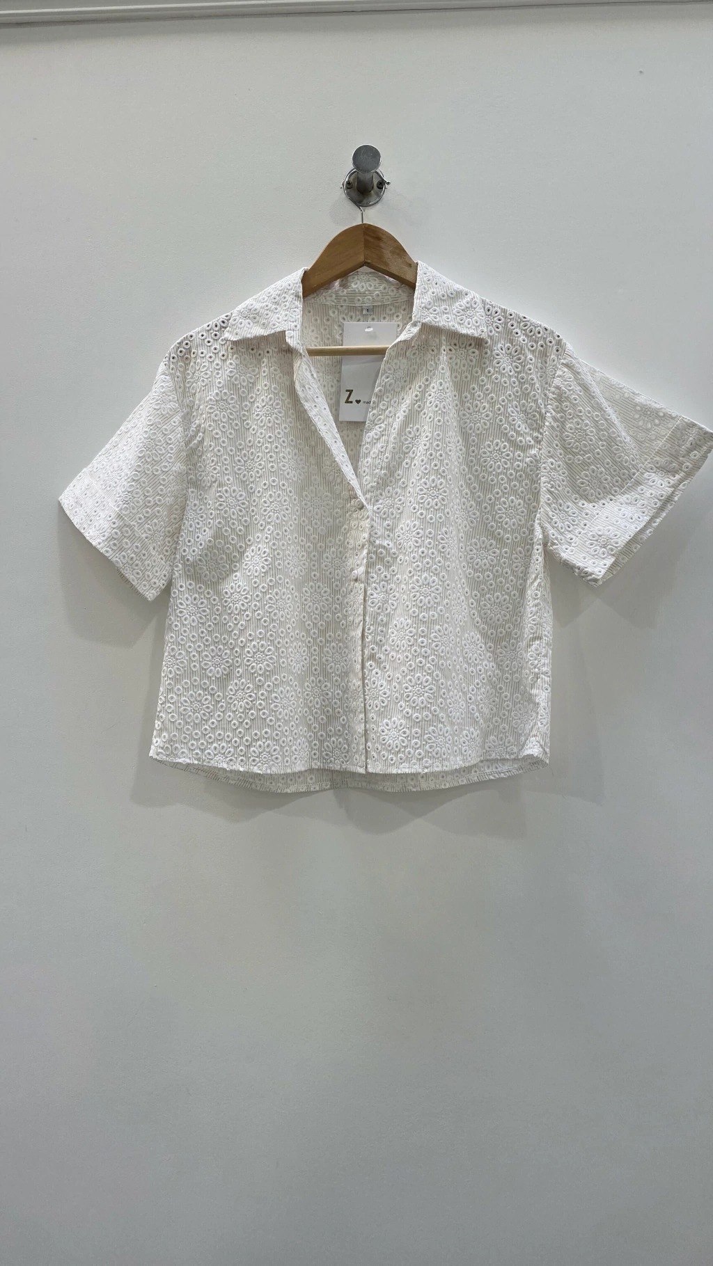 Blusa con cuello camisero y botones frontales, confeccionada en un delicado calado floral que aporta frescura y sutileza. Las mangas con doblez suman un detalle moderno a esta prenda ideal para un look elegante pero relajado