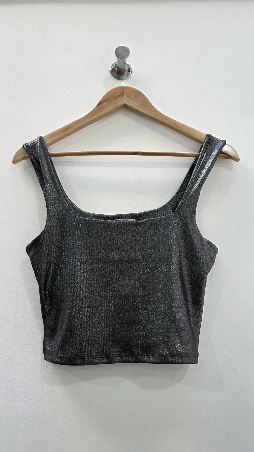 Top foil de escote cuadrado que atrapa la luz con su brillo sutil y sofisticado. Ideal para elevar tus looks con un toque moderno y elegante, sin perder frescura ni actitud.