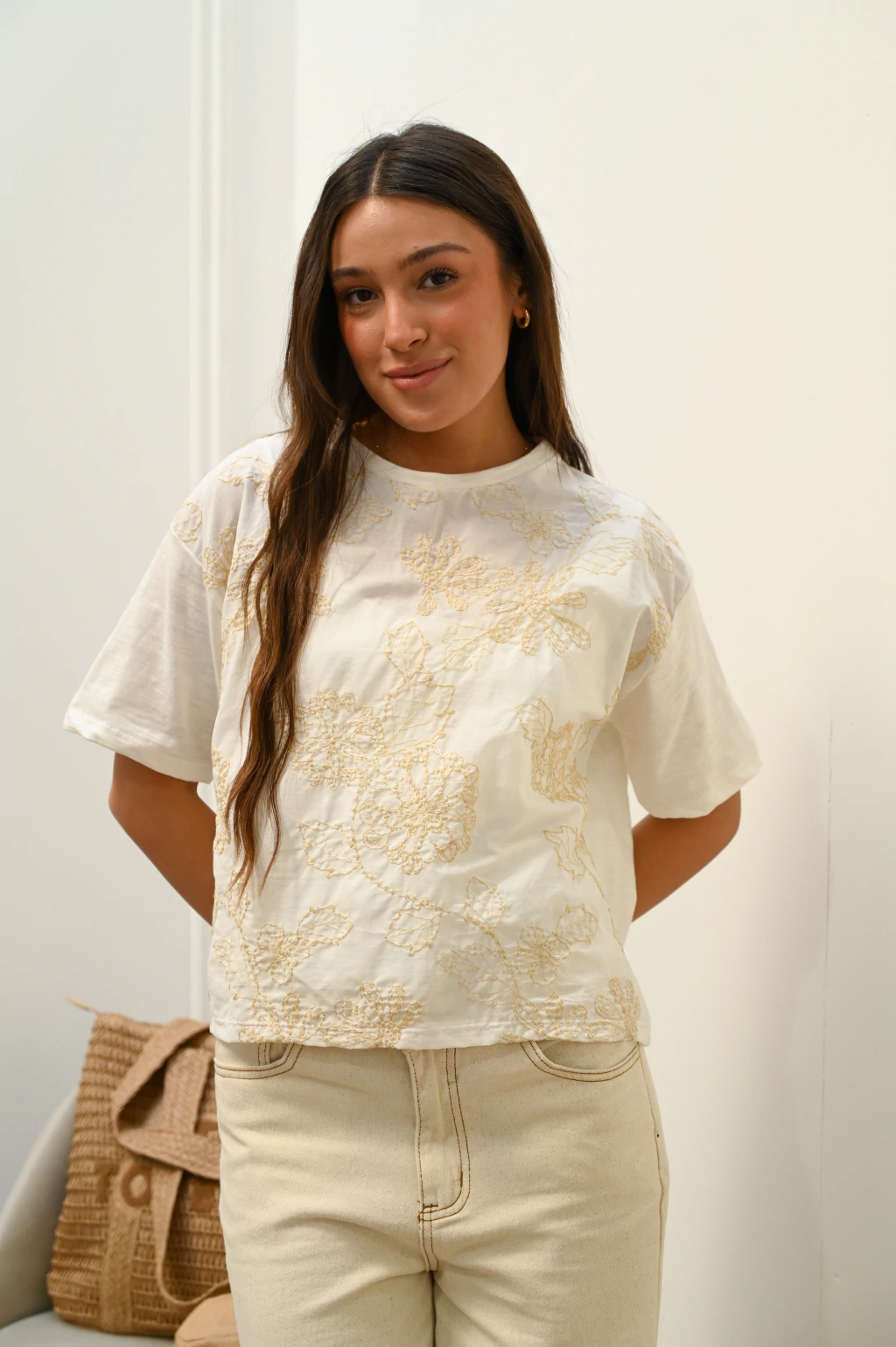 Remera brodery: Ligereza y estilo artesanal. Su tejido calado y fresco con intrincados bordados es perfecto para un look boho-chic y sofisticado. La pieza clave para los días de sol con un toque de encanto atemporal.